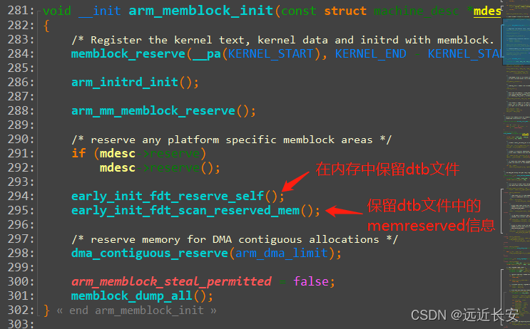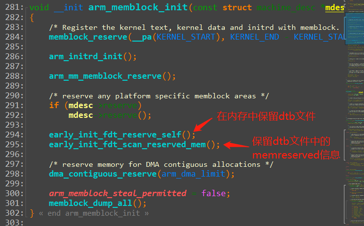 early_init_fdt_scan_reserved_mem(); // 根据dtb中的memreserve信息, 调用memblock_reserve
