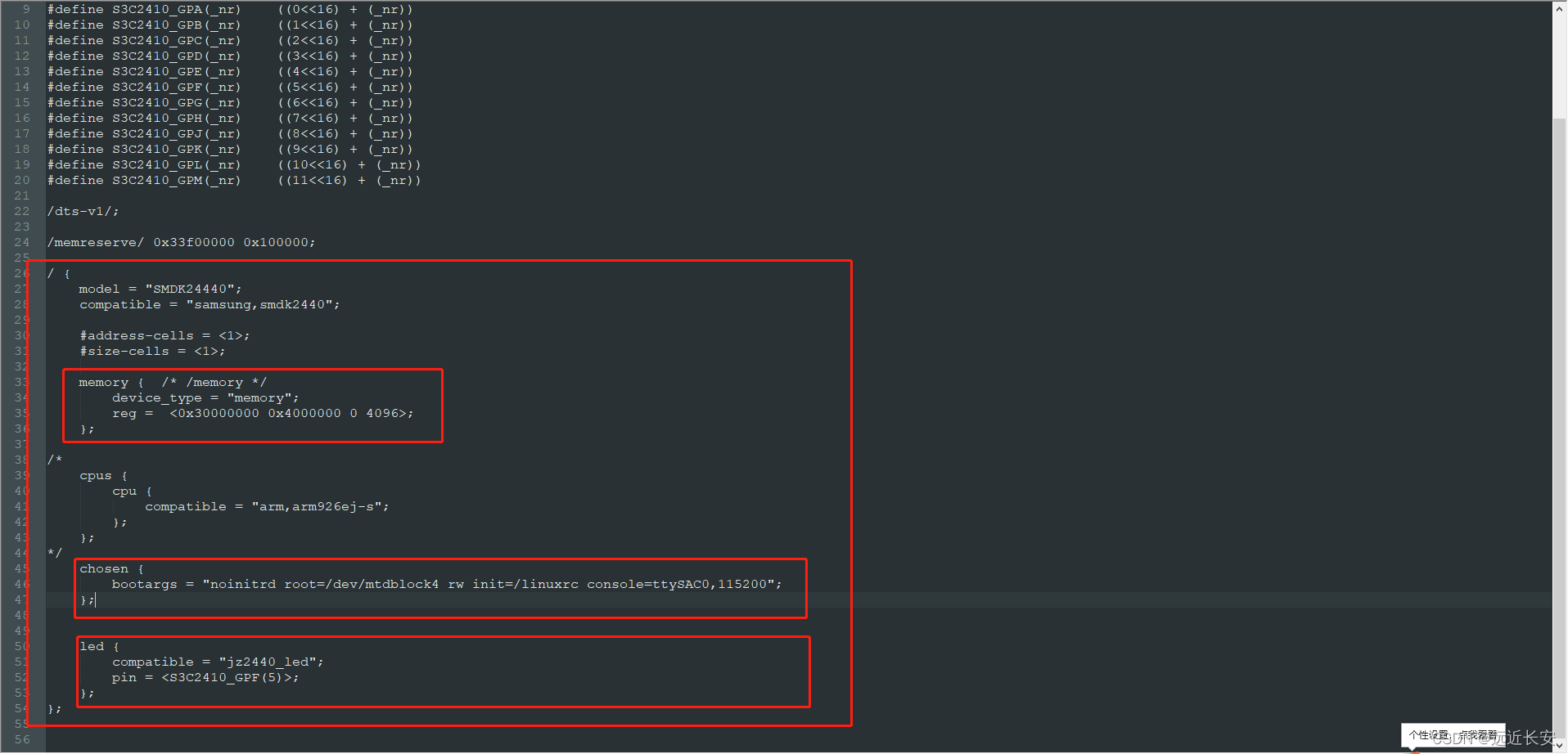 下面来构造一下jz2440.dts的设备树,下面是jz2440.dts的内容。