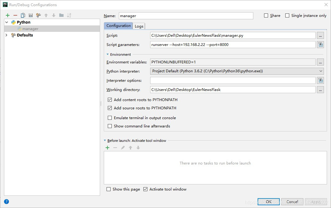 在第二行”Script parameters:“中进行配置 “runserver” 参数,”–threaded”参数我们后面会说明,其他的参数可以自己查看Flask-Script的参数说明。