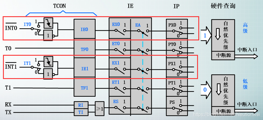 从图中不难看出INT0与INT1是中断引脚,其中经过了TCON、IE、IP这些寄存器,因此我们在写程序时得把这些寄存器功能配置好,CPU才会按照我们的想法只执行!下面分别对这些寄存器进行介绍(稍微了解一下即可,忘记的时候再查)。