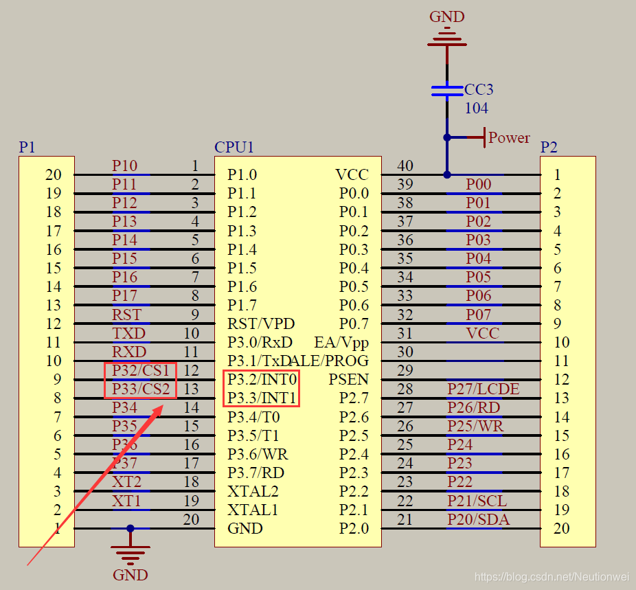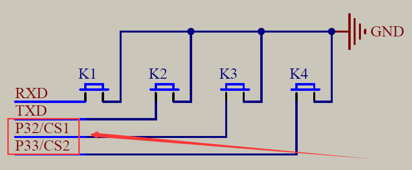 下面我们进行例子来学习外部中断INT0与INT1的使用,例子很简单:使用外部按键模拟外部中断源,当发生外部中断的时候,我们给一个LED灯的电位值取反。下面我们通过原理图来看看要用到的引脚: