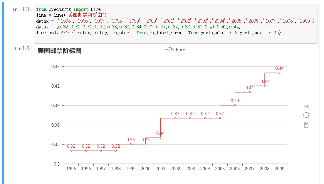 line.add(“Price”,datax, datay, is_step = True,is_label_show = True,yaxis_min = 0.3,yaxis_max = 0.45)