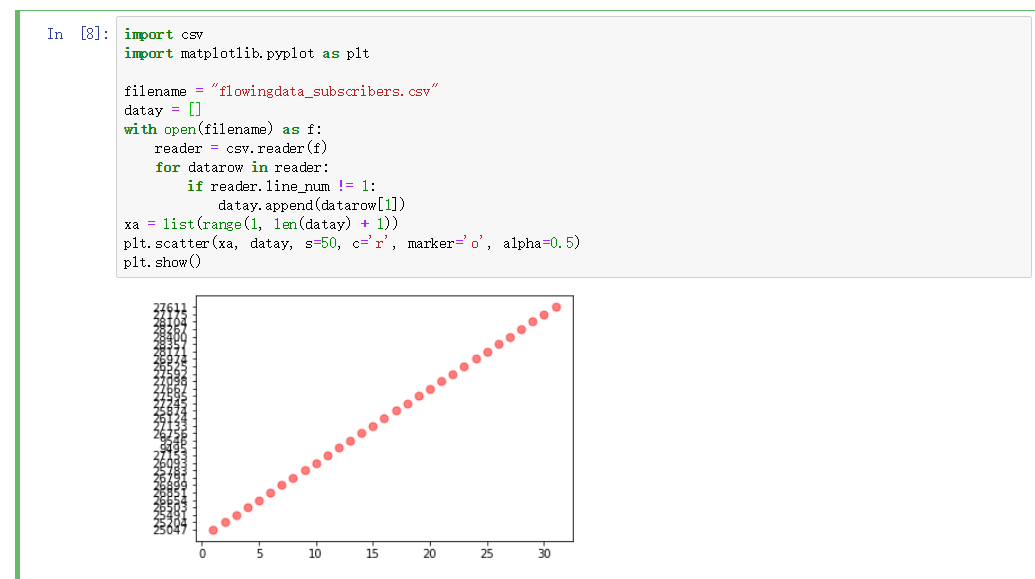 import matplotlib.pyplot as pltfilename = “flowingdata_subscribers.csv”