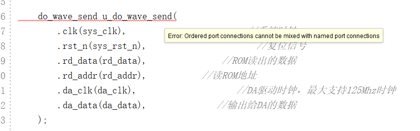 错误提示:ordered port connections cannot be mixed with named port connections。(有序端口连接不能与命名端口连接混合使用)