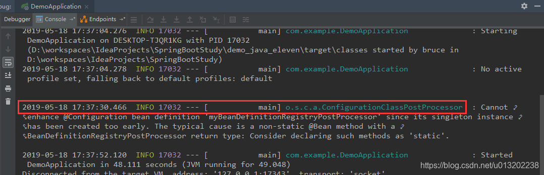 这个警告信息一般情况下不影响我们的程序运行,当我们仅需要使用的BeanDefinitionRegistryPostProcessor实现类,不需要复杂的配置信息时,可以通过使用@component注解来替换@Configuration.