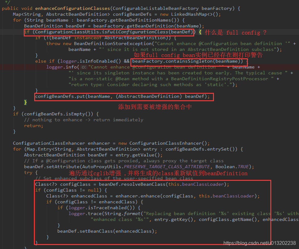 full config: 就是被@Configuration注解标记的配置类, 但是如果配置类在增强之前就被调用getBean()实例化了,就会打印我们所看到的警告信息.