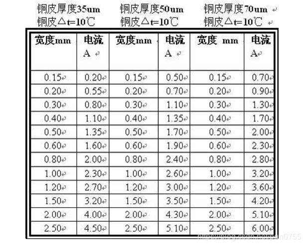 2. 不同厚度,不同宽度的铜箔的载流量见下表: