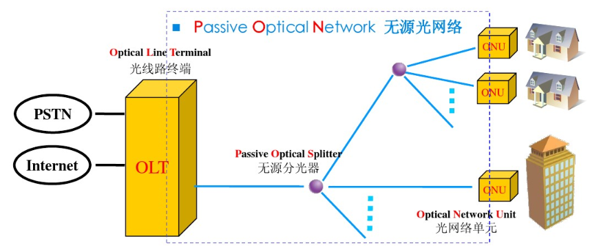 如上所述,OLT执行两个功能,OLT的主要功能是控制信息在整个光分配网络(ODN)上浮动,同时位于中心局的两个方向。通过ODN传输所支持的最大距离为20 km。