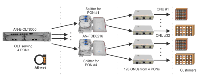 从上图中可以看出,OLT设计用于控制多个PON(在本例中,它用于四个独立的网络)。我们可以看到,如果每个PON有32个连接,OLT可以将数据分配给128个ONT。OLT具有特定的标准,因此它可以与来自不同制造商的ONT一起使用。