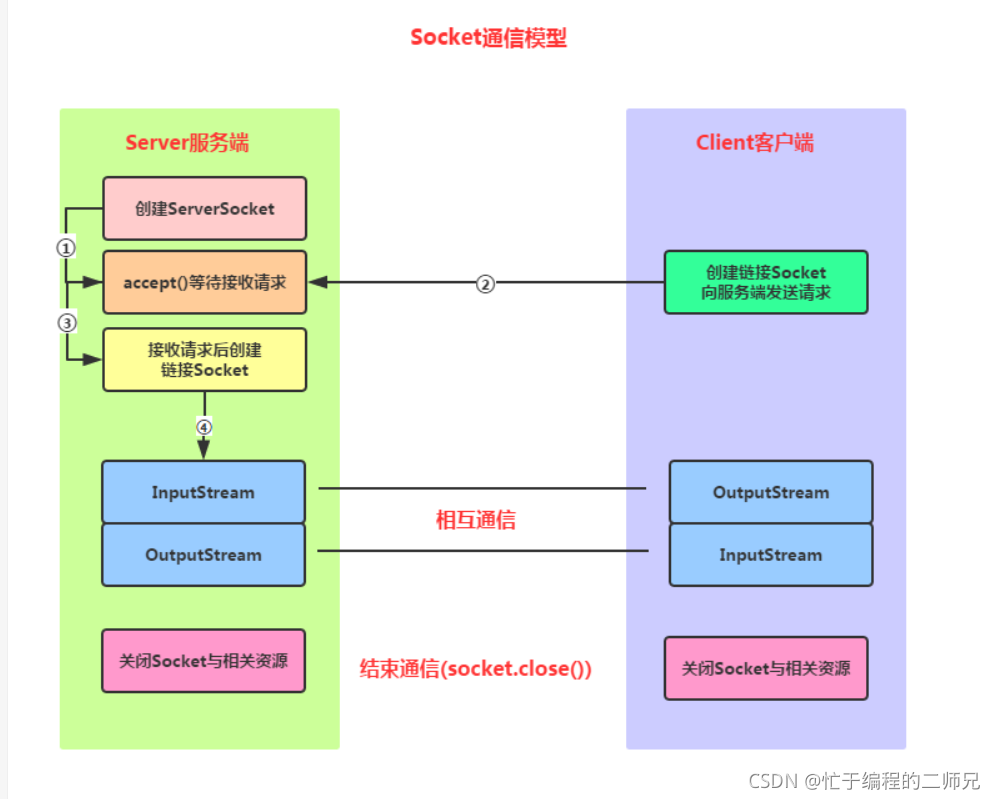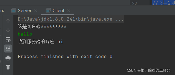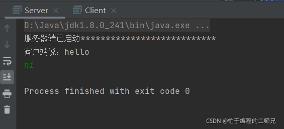 例子中只能实现服务器端和客户端互相发送一条消息,如果想相互交互多条消息,在客户端将 与服务端相互通信的语句加个while循环就好。