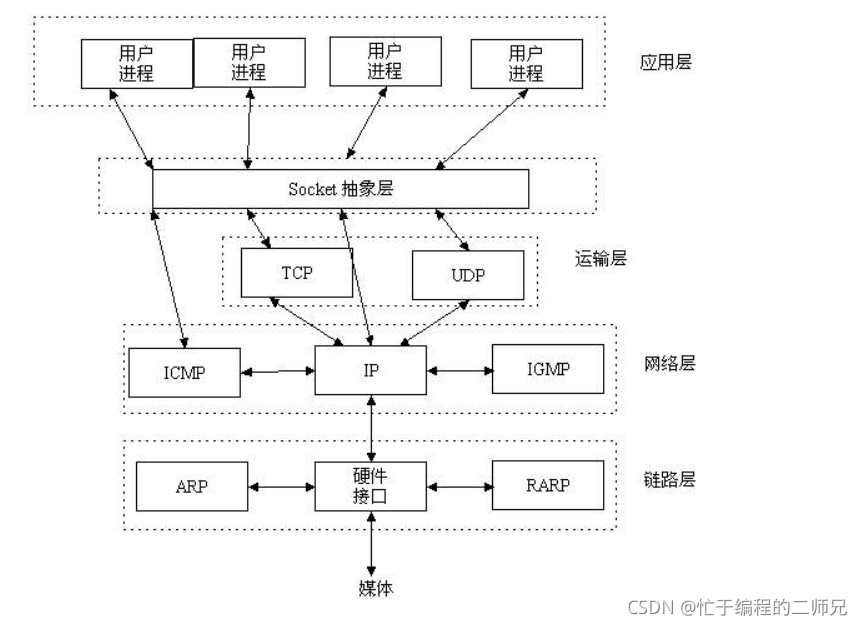 应用层:TFTP,HTTP(面向连接),SNMP,FTP,SMTP,DNS,Telnet 等等
