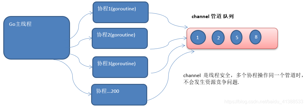 - 3) 线程安全,多 goroutine 访问时,不需要加锁,就是说 channel 本身就是线程安全的