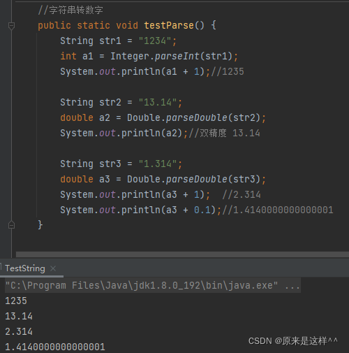 🚐七:字符串转数字 int a = Integer.parseInt() double b = Double.parseDouble() 包装类.parse基本类型 返回值是你想要 字符串转换成 小数 还是 整数