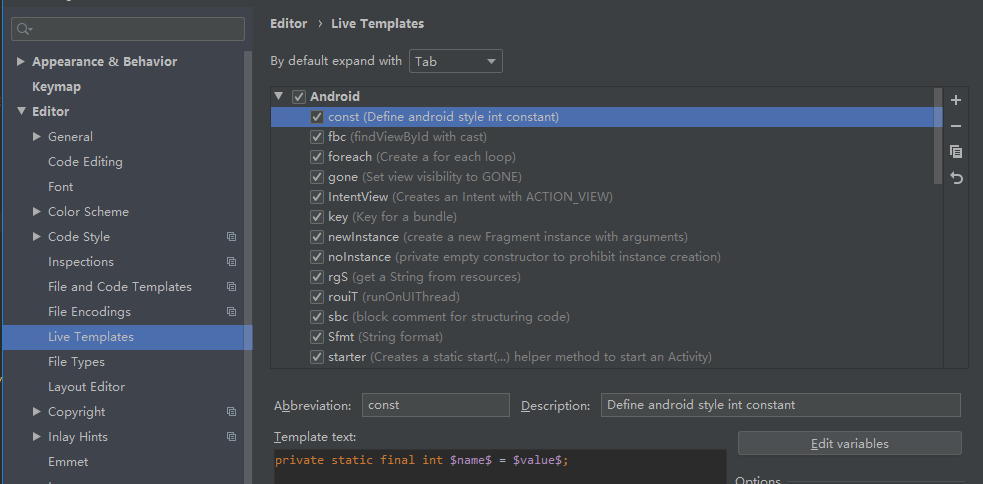 android studio中有一些模板可以加快开发者的开发效率,比如下面android自带的模板,输入const就会提示常量定义模板,具体内容在Templates text中展示,还有fbc,foreach等,可能大家平时没注意。