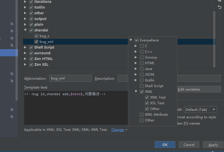 模板组创建好以后,点击右侧的“+”就可以创建自己的模板了。比如下面展示了一个bug模板,姓名,日期固定,后面补上bug id和问题描述即可。这里需要注意,Template text定义好之后,需要点击“Define”按钮选择模板的适用场景(xml or java or C++等等)。