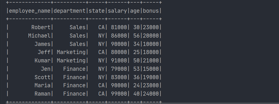 val dataFrame2 = simpleData2.toDF("employee_name","department","state","salary","age","bonus")