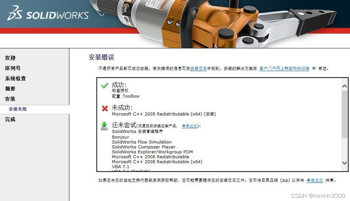 第2个雷是安装中间出现“solidworks安装时出现内部错误:该产品组件的windows installer没按预期运”,保存下错误日志,发现最后一行是:
