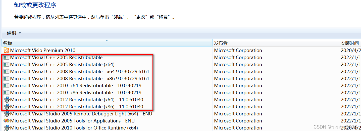 这个表示之前其他软件装过Microsoft C++ xxxx Redistributable程序,与本次安装发生冲突了,解决办法是到“程序”中先卸载掉之前安装的旧程序,所有带Microsoft C++字样的都卸载掉,如下图: