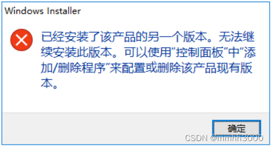 手动找到这个文件双击运行,确实报错:已经安装了该产品的另一个版本。无法继续安装此版本。