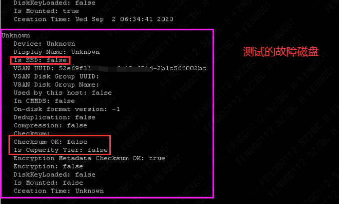 5、 从磁盘组拷贝出的故障磁盘的UUID号: Absent vSAN Disk (vSAN UUID:d-2b1c566002bc)。SSH登录ESXI主机,使用命令“esxcli vsan storage list” 查看到测试磁盘的状态