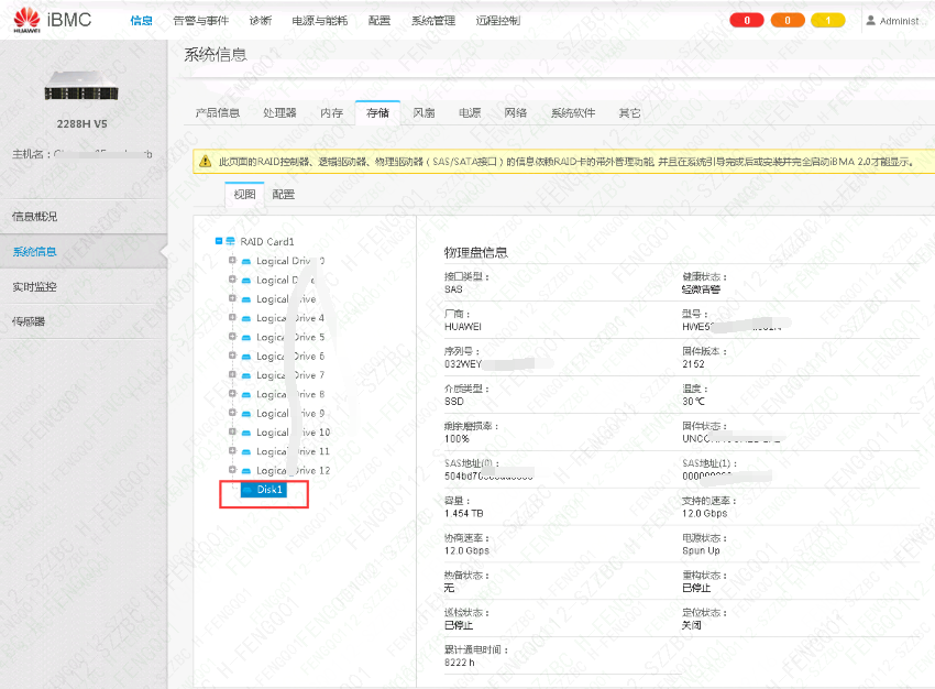 8、登录主机的IBMC,对新添加的磁盘做RAID0操作。不同的厂家配置RAID的方式不一样。