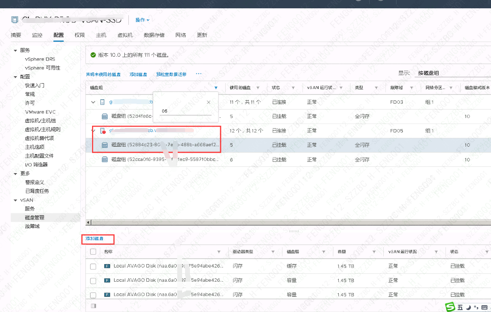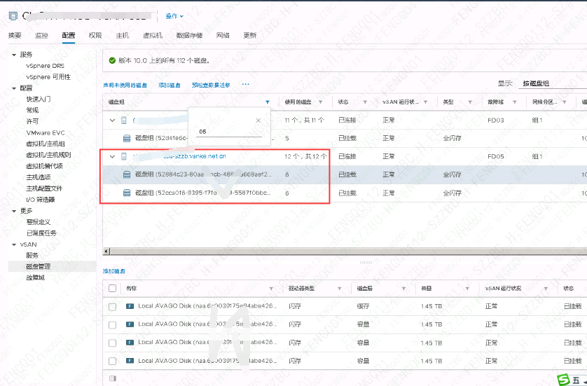 1、测试前检查,与选定测试的磁盘。选中“群集”→“配置”→“VSAN”→“磁盘管理”→选定的主机→选中测试磁盘