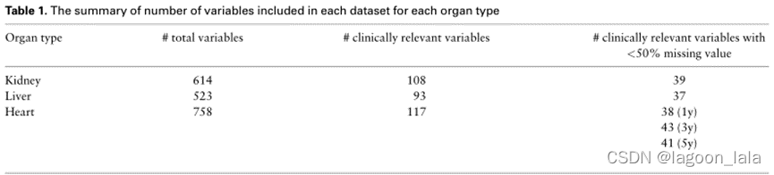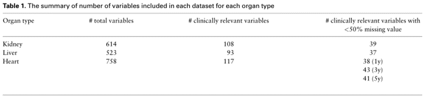 表1总结了最终预测模型中包含的每种器官类型的变量数量。表2总结了每种器官类型在每个预测窗口中的人口统计信息。每种器官类型的完整变量列表在补充材料中报告。