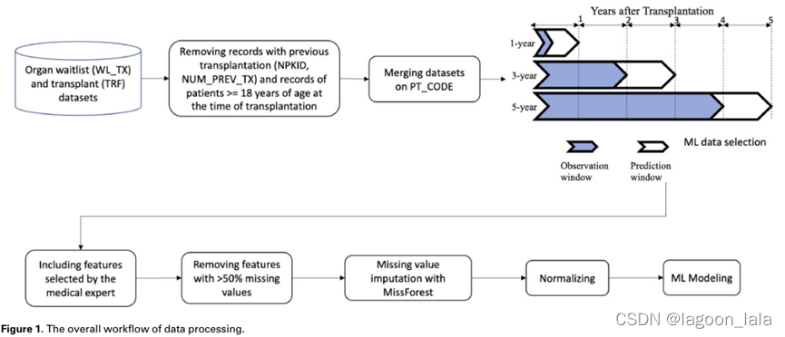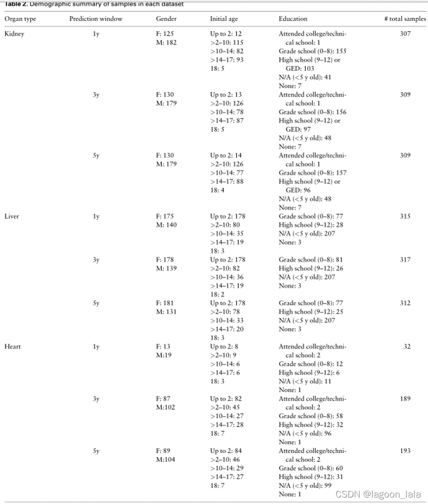对于这项研究中的三种器官类型中的每一种,我们考虑了1年、3年和5年的三个不同的结果预测时间窗(图1),类似于其他预测儿科器官移植结果的研究[16,36]。二元预测结果是移植后在预测窗口内住院。
