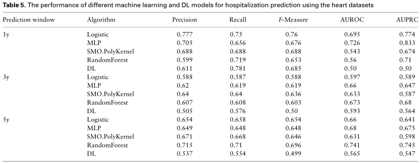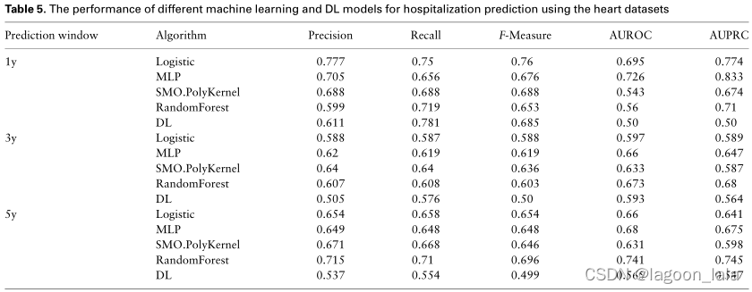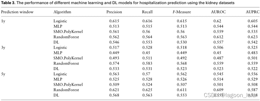 表3-5报告了不同传统ML和DL模型的性能。每种模型都使用与不同器官类型的不同结果预测窗口相对应的不同数据集。由于分类任务是二元的(0或阴性结果:患者将不住院,1或阳性结果:患者将住院),因此使用精确度、召回率、F-MEASURE、AUROC和AUPRC指标来衡量性能。