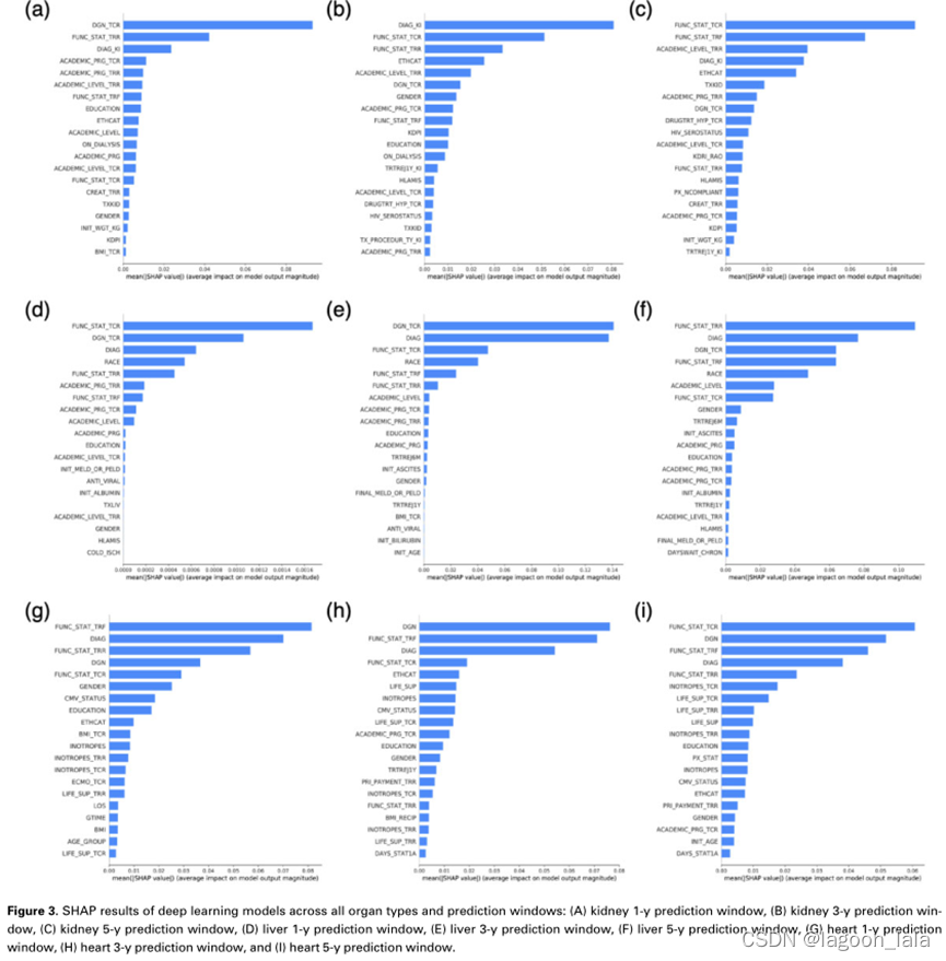 在本研究中,将Shap应用于DL模型的结果以变量重要性的方式显示(图3)。每行的条形图对应一个器官类型:肾脏、肝脏和心脏。每列中的条形图指的是对1年、3年和5年结果的预测。这些曲线图中的变量根据重要性进行排序(降序)。变量越重要,对与其相关的模型输出的影响程度就越大。注意,本研究中产生的Shap解释是全局的(即,通过对数据集中所有样本的Shap值大小求和来提供关于数据集中的整个样本的解释,而不是关于特定样本的解释)。此外,为了降低计算成本,我们使用k-Means算法将样本总结为50个加权样本(对于心脏1年数据集为25个)[51]。相应的形状汇总曲线图可在补充材料中找到。考虑到所有9种器官类型和预测窗口的模型,通常情况下,受者的功能状态(在列出、移植和随访时)以及主要诊断(在列出和移植时)、种族和种族是最重要的变量。