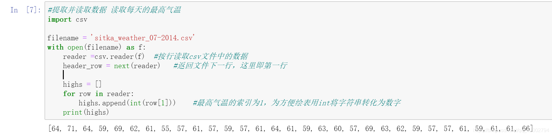 highs.append(int(row[1])) #最高气温的索引为1,为方便绘表用int将字符串转化为数字