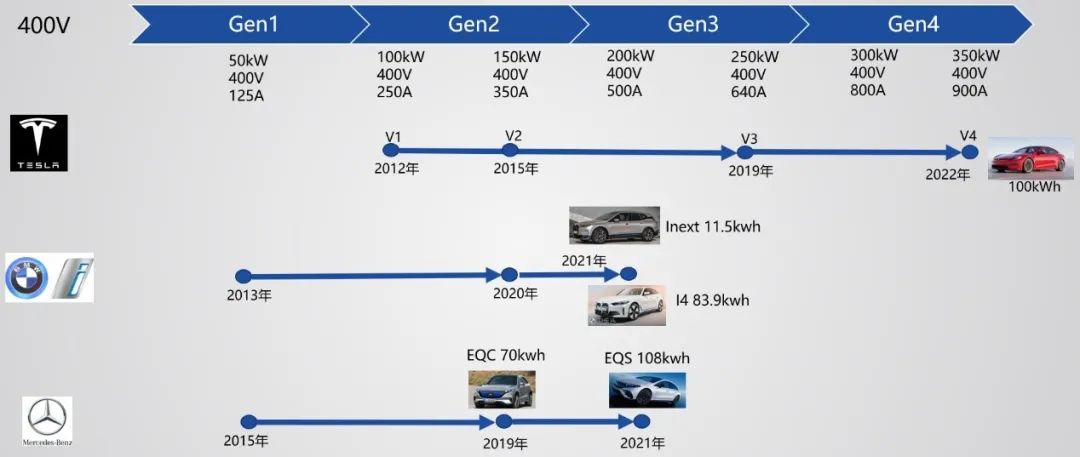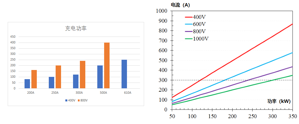 400V分支下,大部分的标杆企业已经从150kW往200kW开始努力,而800V快充的设计,也开始从350A的分水岭,往500-600A的更大电流去设计。
