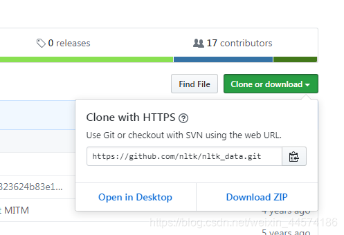 2.在查阅了csdn各种博客后,我到(https://github.com/nltk/nltk_data),官网上点击Clone or download—>Download ZIP下载了nltk的数据包