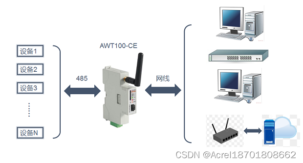 ■ AWT100-CE可以实现485 转以太网的数据传输。可做TCP客户端,支持透传或我司云平台协议。