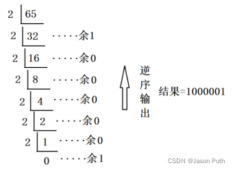 十进制转换成二进制:比方说十进制数 65 转换成二进制,我们可以使用短除法,65 对 2 整除商 32 余数为 1,把 1 写在旁边,接着 32 对 2 整除商 16 余数为 0,把 0 写在旁边,用 16 整除 2 商 0 余数为 0,把 0 写在旁边,这样进行下去直至商为 0 时为止。然后把余数逆序排列就得到了 65 的二进制。如下图所示: