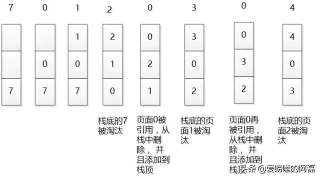假定系统为某进程分配了3个物理块,进程运行时的页面走向为 7 0 1 2 0 3 0 4,开始时3个物理块均为空,那么LRU 算法是如下工作的: