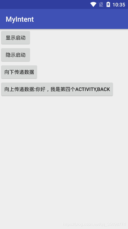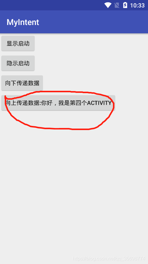 intent.putExtra(“key”, “你好Main4Activity,我是MainActivity”); 传递的是一个string类型的数据 “key”-> key,”你好Main4Activity,我是MainActivity” ->value;