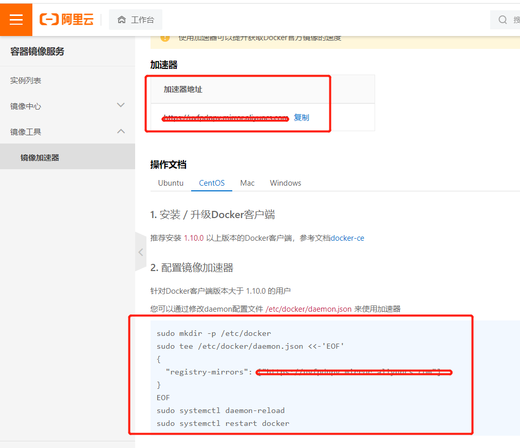 阿里云官网--->右上角控制台---->搜索框输入容器镜像服务---->左侧栏镜像中心内的加速器--->选择文件系统
