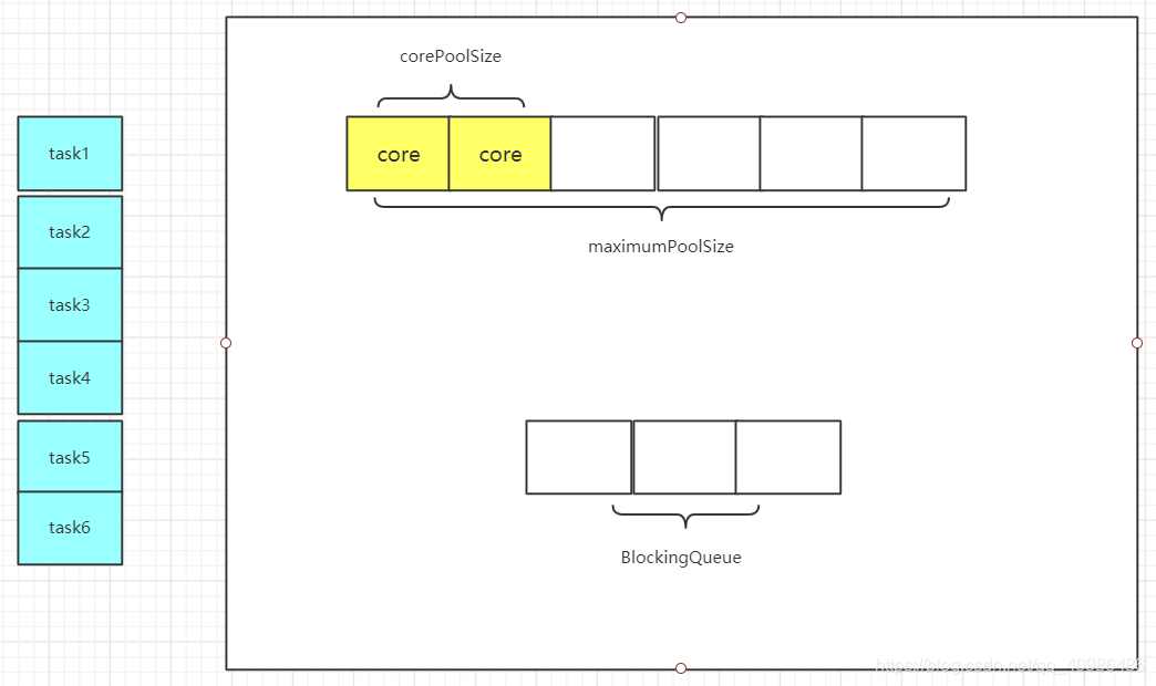 以核心线程数为2,最大线程数为6,阻塞队列容量为3 为例: