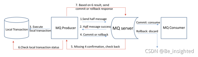 5.在断网或者是应用重启的特殊情况下,上述步骤4提交的二次确认最终未到达 MQ Server,经过固定时间后MQ Server将对该消息发起消息回查。