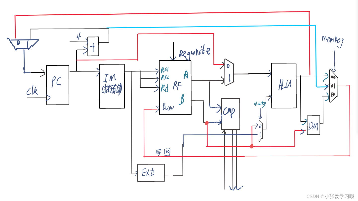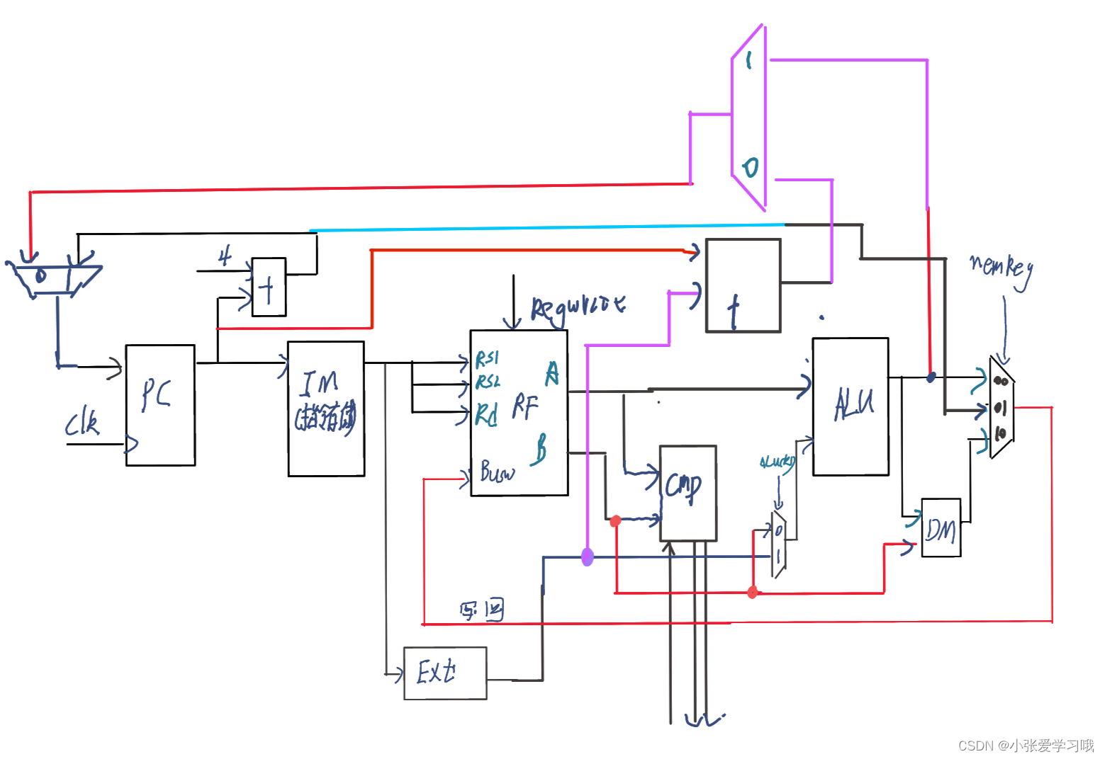 改进:这几天思考我向pc+4和pc+立即数这样的操作其实没必要使用ALU来完成,不如直接使用一个加法器实现,因此对上面的数据通路做了一个小的改变(主要是写代码的是否变了)