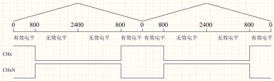 正好配置TIM1为中央对齐模式1,在上面代码的配置中,载波周期为15KHz,TIM_Period(ARR)=2400,CH1的TIM_Pulse(CCR)=800。采用的PWM1模式,即CNT小于CCR时,输出有效电平,大于CCR小于ARR时,输出无效电平,又配置CHx的有效电平为高电平,CHxN的有效电平为高电平,则可以得到下面的PWM波形: