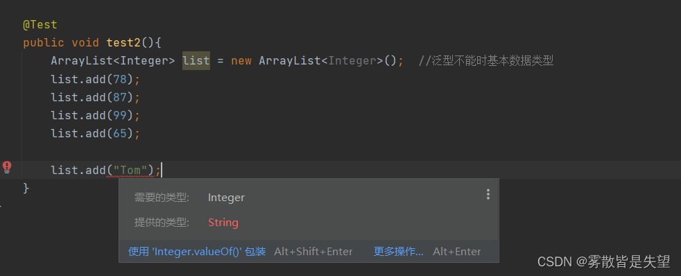 ArrayList<Integer> list = new ArrayList<Integer>(); //泛型不能时基本数据类型