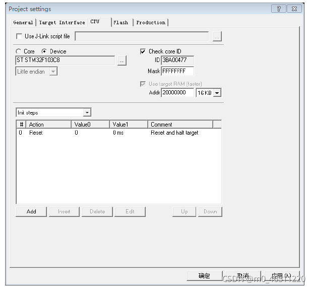 第一步:Option–>Project Settings–>CPU下选择 Device 在下拉菜单中找到自己的芯片型号后点击确定。