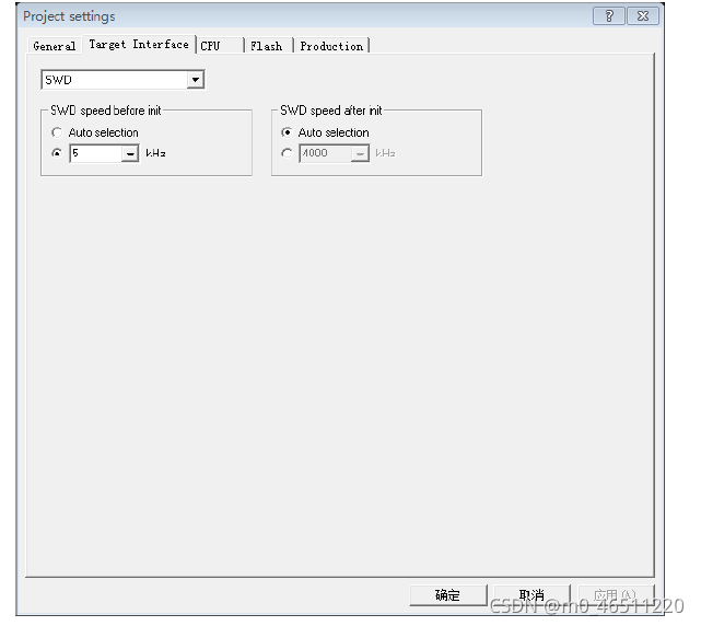 第二步:目标接口方式和速度设置:打开Target Interface选项,选择SWD方式,下边的SWD speed before init和SWD speed after init可以选择为Auto selection。
