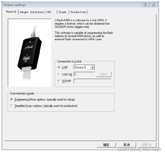 第一步:Options->Project settings或者使用快捷键“Alt-F7”打开工程设置界面。选择默认的USB-Device 0