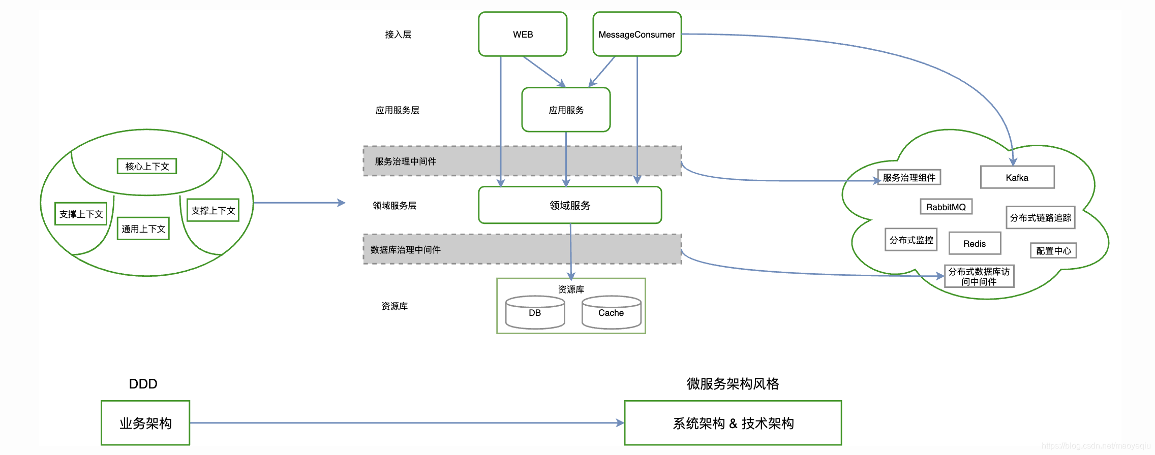 DDD的核心诉求就是将业务架构映射到系统架构上,在响应业务变化调整业务架构时,也随之变化系统架构。而微服务追求业务层面的复用,设计出来的系统架构和业务一致;在技术架构上则系统模块之间充分解耦,可以自由地选择合适的技术架构,去中心化地治理技术和数据。