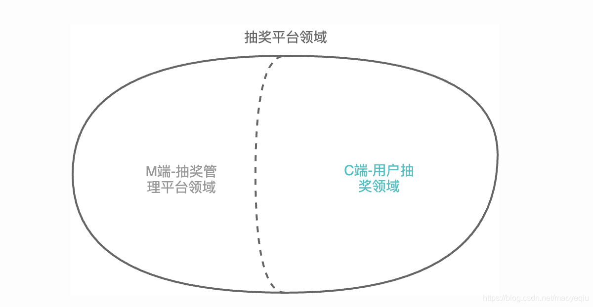 前文提到,我们的用户划分为运营和用户。其中,运营对抽奖活动的配置十分复杂但相对低频。用户对这些抽奖活动配置的使用是高频次且无感知的。根据这样的业务特点,我们首先将抽奖平台划分为C端抽奖和M端抽奖管理平台两个子域,让两者完全解耦。