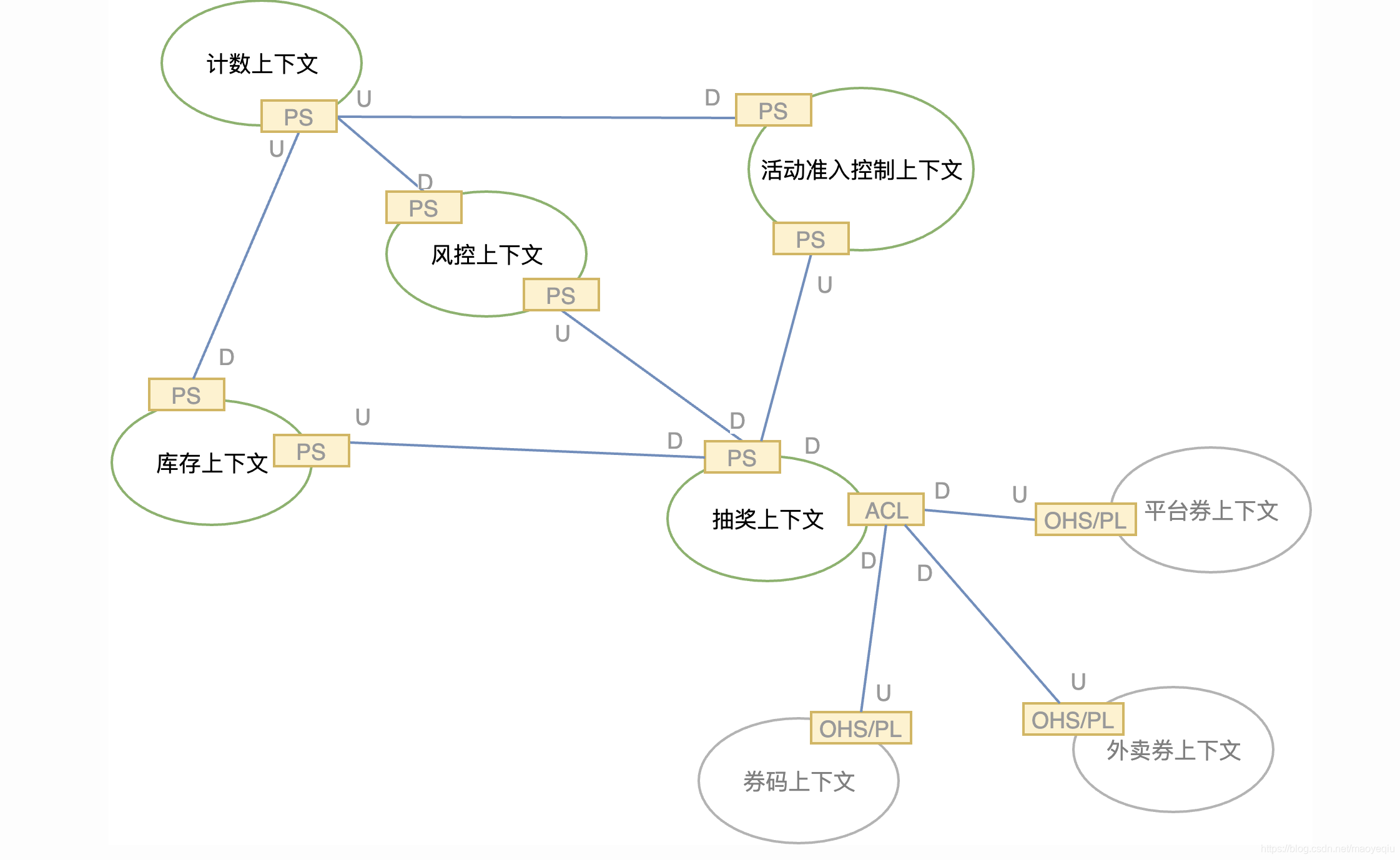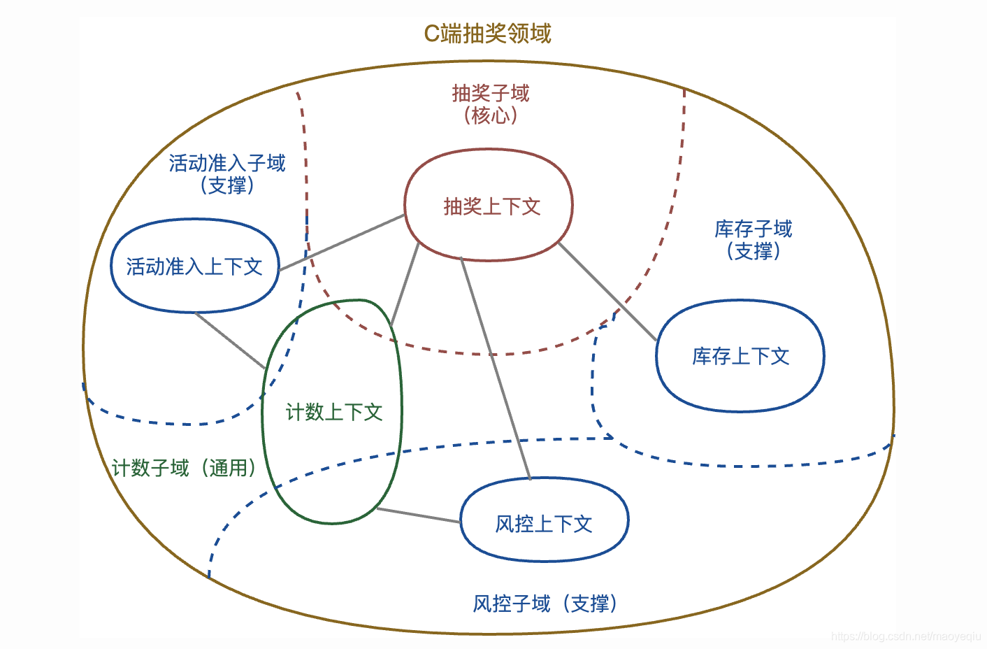 可以看到,通过DDD的限界上下文划分,我们界定出抽奖、活动准入、风控、计数、库存等五个上下文,每个上下文在系统中都高度内聚。